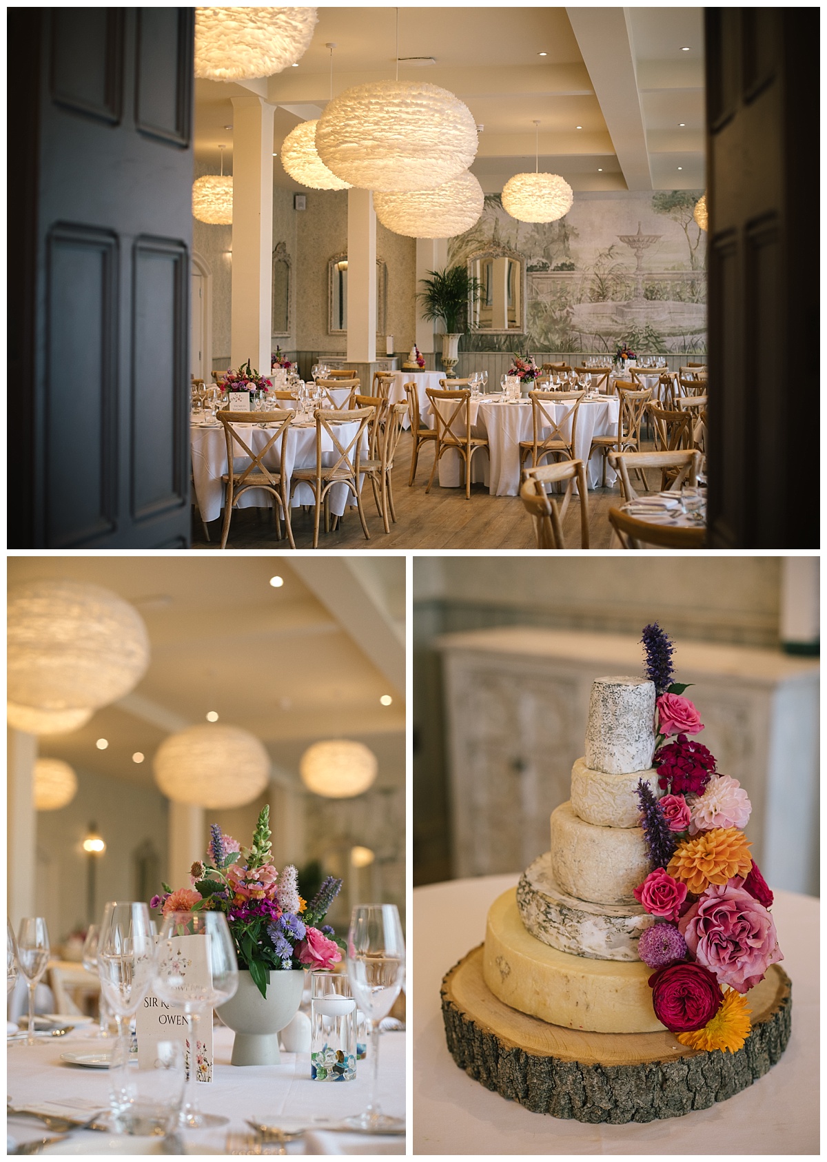 A wedding cake made of cheese, and detail photos of wedding reception at Wennington Hall wedding photography
