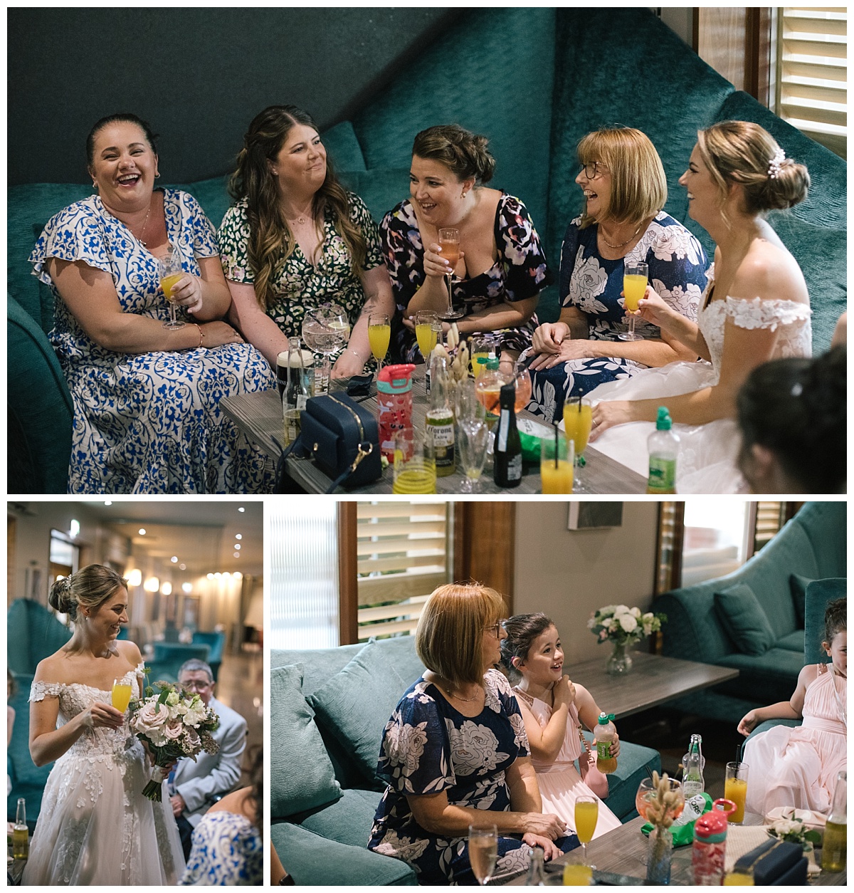 Smiths hotel wedding guests laugh together in the dinning area of the hotel during wedding photography session Dumfries and Galloway photographer