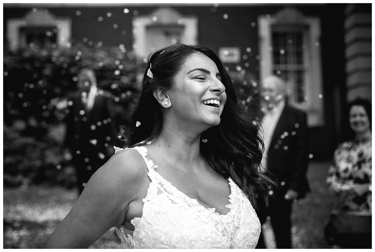 A black and white photo of a bride at Stockport town hall wedding photographs