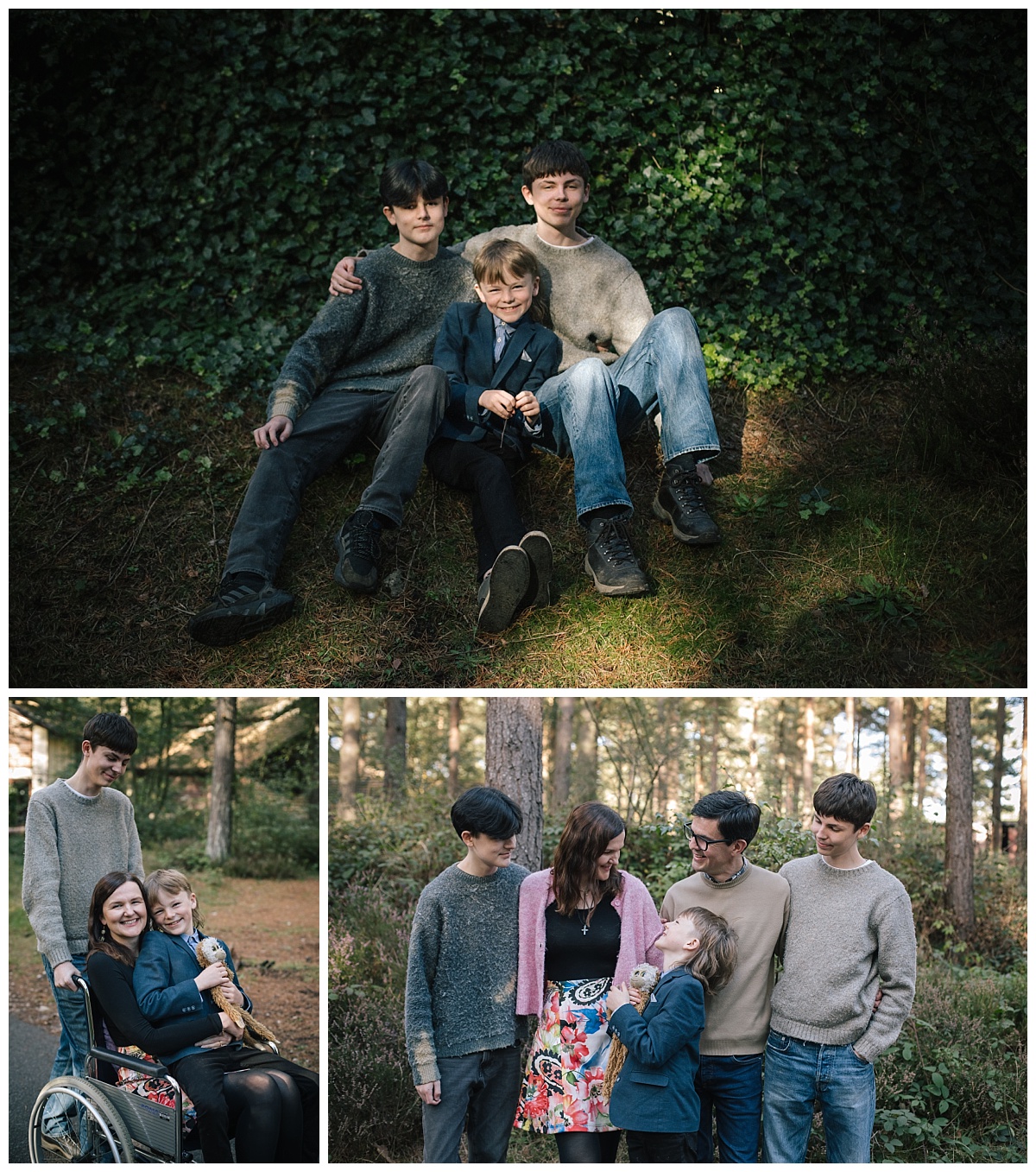 A family of three boys pose with parents during photo shoot at Center Parcs Whinfell Forest family photographer